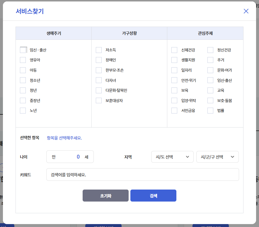 복지 서비스는 연령대(아동, 청소년, 노년 등), 가구 상황(저소득, 장애인, 다자녀 가정 등), 거주 지역, 키워드 기준으로 검색이 가능합니다.