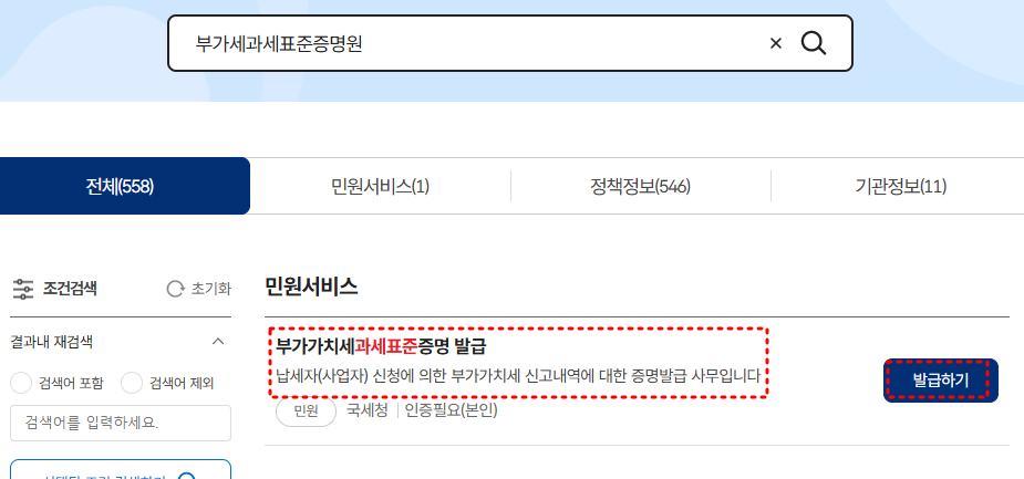 - 상단 검색창에 "부가가치세 과세표준증명원"을 입력하고 검색합니다.