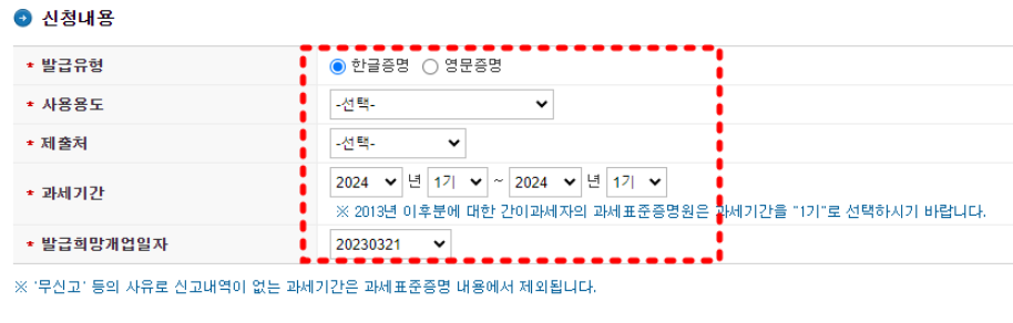 - 신청내용: 발급유형(한글/영문), 사용용도, 제출처, 과세기간을 선택합니다.