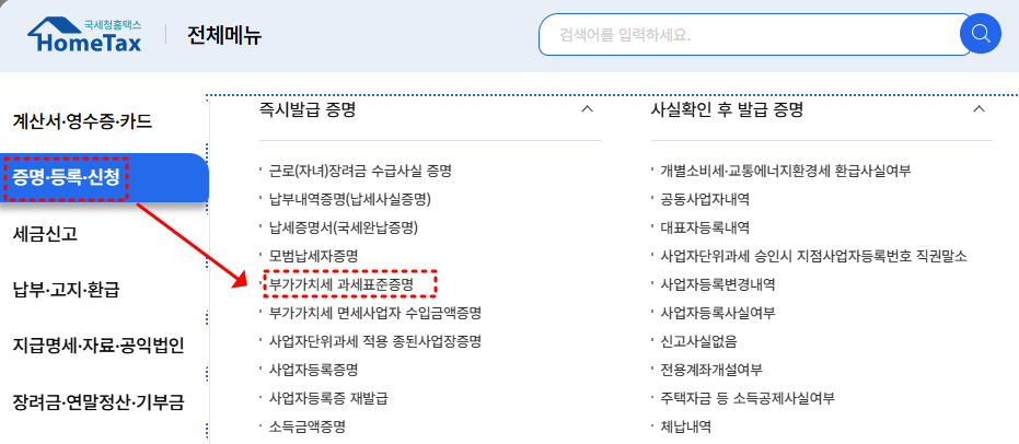 상단 메뉴에서 '증명/등록/신청' → '즉시발급증명' → '부가가치세 과세표준증명' 선택