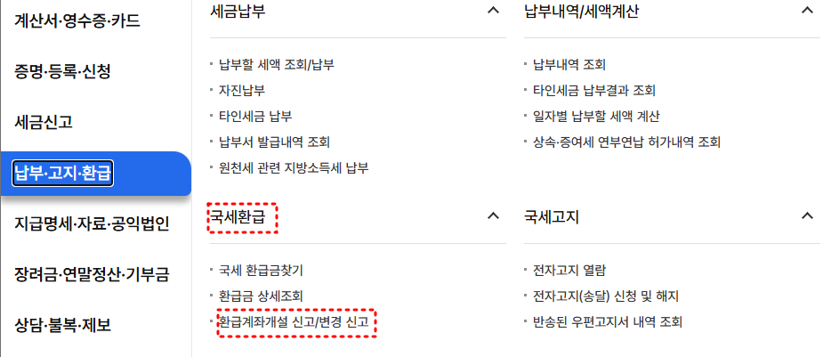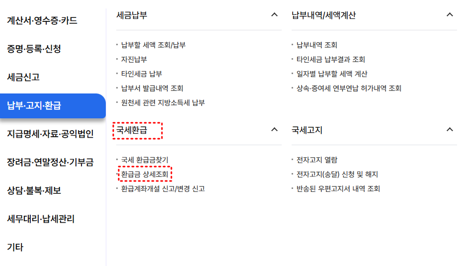 상단 메뉴에서 ‘납부고지, 환급’을 선택한 뒤, 좌측 메뉴에서 ‘국세환급’을 클릭하여 ‘환급금 상세조회’ 또는 ' 환급금 계좌계설 신고/변경 신고'를 선택합니다.