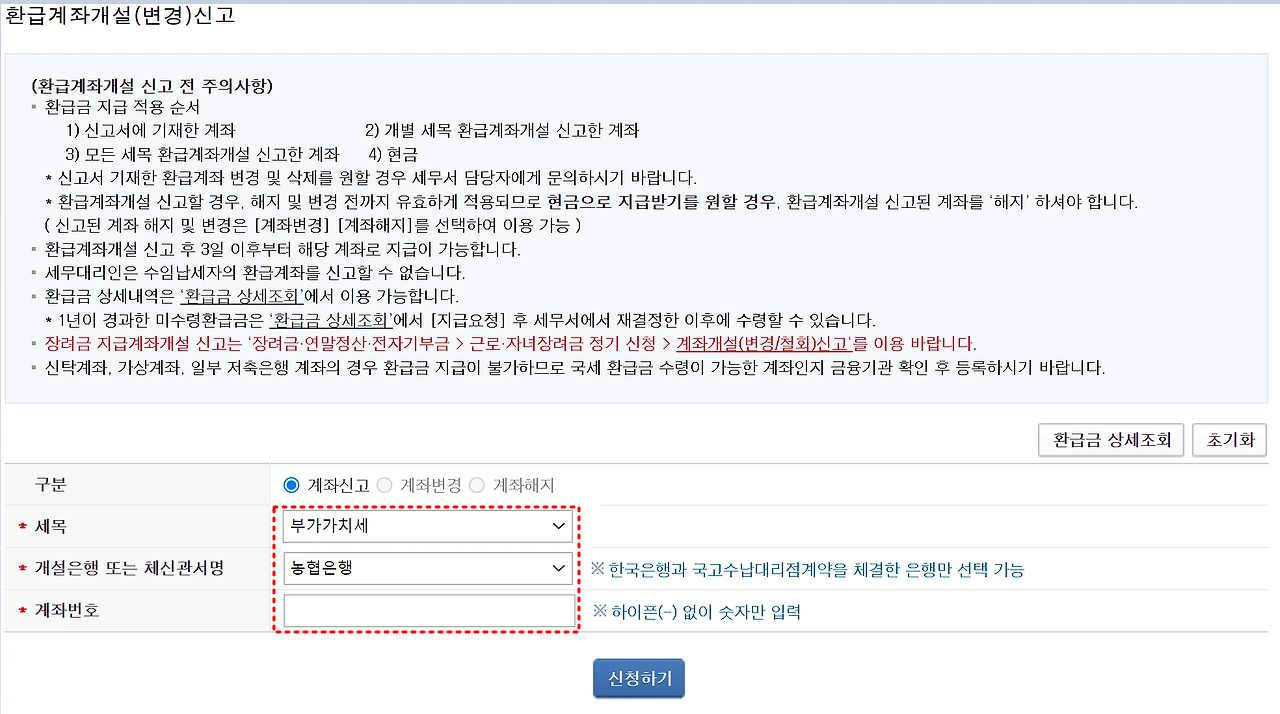 환급금을 조회한 후, 환급을 원하는 계좌 정보를 입력하여 신청합니다.