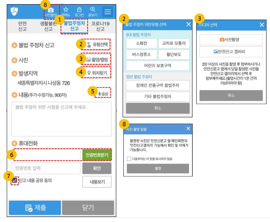 먼저 스마트폰에 안전신문고 앱을 설치한 후, 불법주차 차량의 사진을 찍어 정확한 위치 정보와 함께 업로드합니다.