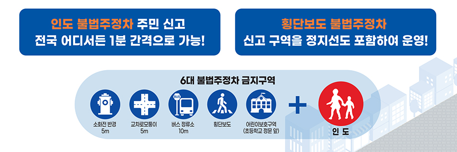 또한, 지역별 교통 단속 CCTV를 통해 실시간으로 불법주차를 단속하며, 차량 블랙박스나 개인의 휴대폰을 통해 찍은 영상을 제출하여 불법주차를 신고할 수 있습니다.