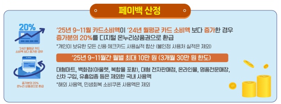 2024년 월평균 카드 소비액 대비 2025년 9~11월 월별 소비액이 증가한 경우, 증가분의 20%를 환급해줍니다.