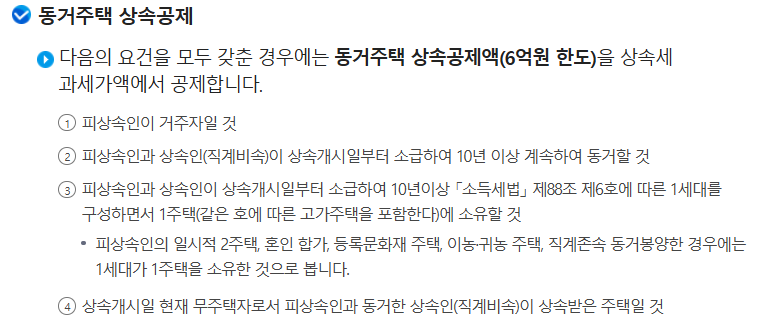 피상속인과 상속인이 10년 이상 동거한 주택에 대해서는 상속세 면제 한도액에 포함되어 최대 6억 원까지 공제를 받을 수 있습니다.