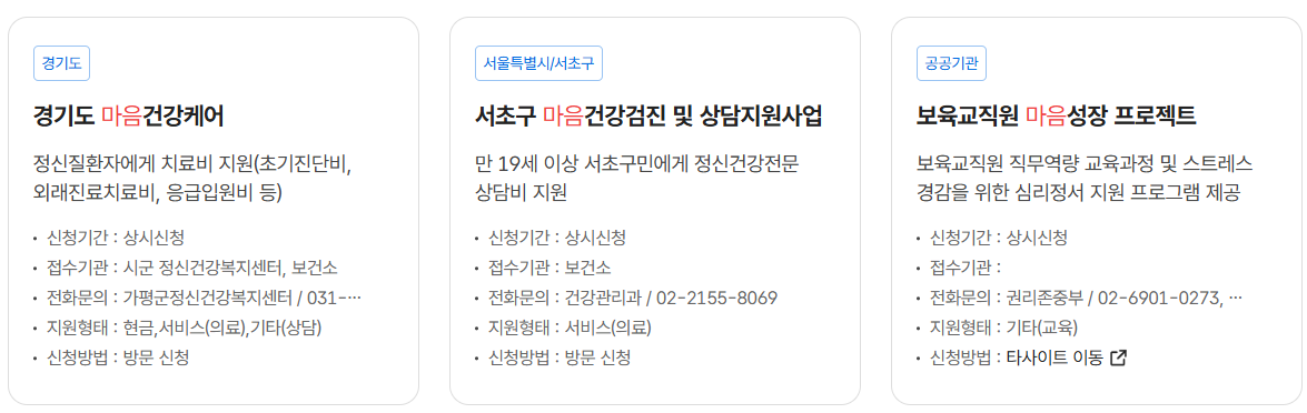 심리치료의 경우 비용이 부담이 될 수있는데요, 정부에서 지원하고있는 마음정책의 도움을 받아 비용절감은 물론, 여러가지 정보를 얻을 수 있습니다.