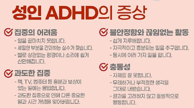 성인 ADHD 자가진단법을 통해서 미리 확인해보시고 이를 극복하기 위한 방법을 찾아보시길 바랍니다.