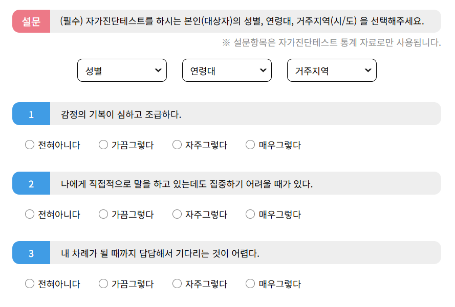 더욱 세부적으로 성인 ADHD 자가진단을 원한다면, 심리상담센터에서 제공하고있는 성인 ADHD 자가진단테스트를 통해서 증상에 대한 정도를 이해하고 예방할 수 있도록 간이검사를 받아볼 수 있습니다.