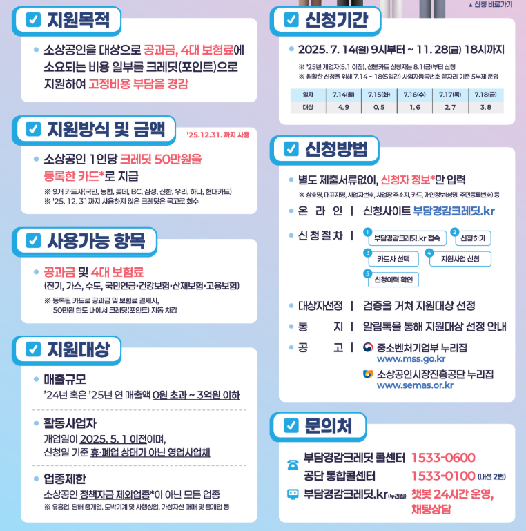 소상공인 부담경감 크레딧50만원 신청은 2025년 7월 14일부터 11월 28일까지 할 수 있습니다.