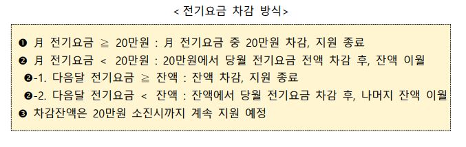- 만약 월 전기요금이 20만 원 미만인 경우, 전액 차감되고 나머지 금액은 다음 달로 이월됩니다. 이 과정은 지원금 20만 원이 모두 소진될 때까지 반복됩니다.
