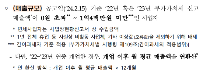 연매출액의 기준은 22년 또는 23년 부가세 신고시 매출액이 0원초과 ~ 1억 4백만원 미만에 해당해야하며, 면세사업자는 사업장현황신고서상 수입금액을 대상으로합니다.