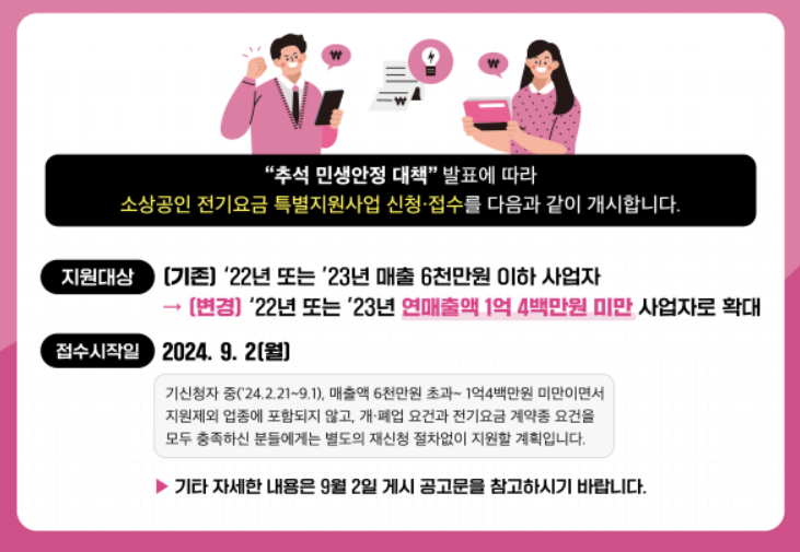 이번에 추석민생정책으로 소상공인 전기요금 특별지원 대상자의 기준이 완화되어 기존에 지원받지 못한 대상자들도 이번에는 전기요금 특별지원을 받을 수 있습니다.