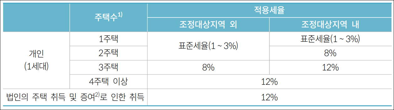 또한, 조정대상지역의 경우 주택 수에 따라 1 주택은 1~3%, 2 주택은 8%, 3 주택 이상은 12%의 취득세율이 적용됩니다.