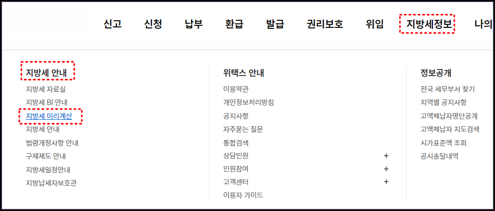 위택스 홈페이지에 접속 후 '지방세 미리계산' 메뉴를 선택하면 취득세 계산기를 이용할 수 있습니다.