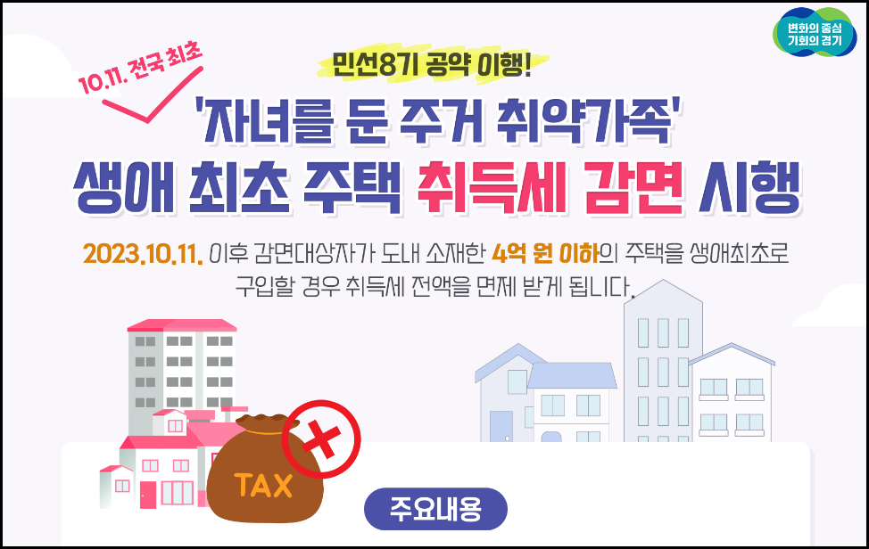 해당 제도는 경기도에서는 유자녀 세대를 대상으로 살아생전 처음으로 주택을 구입할 때 취득세를 전액 면제혜택을 받을 수 있습니다.