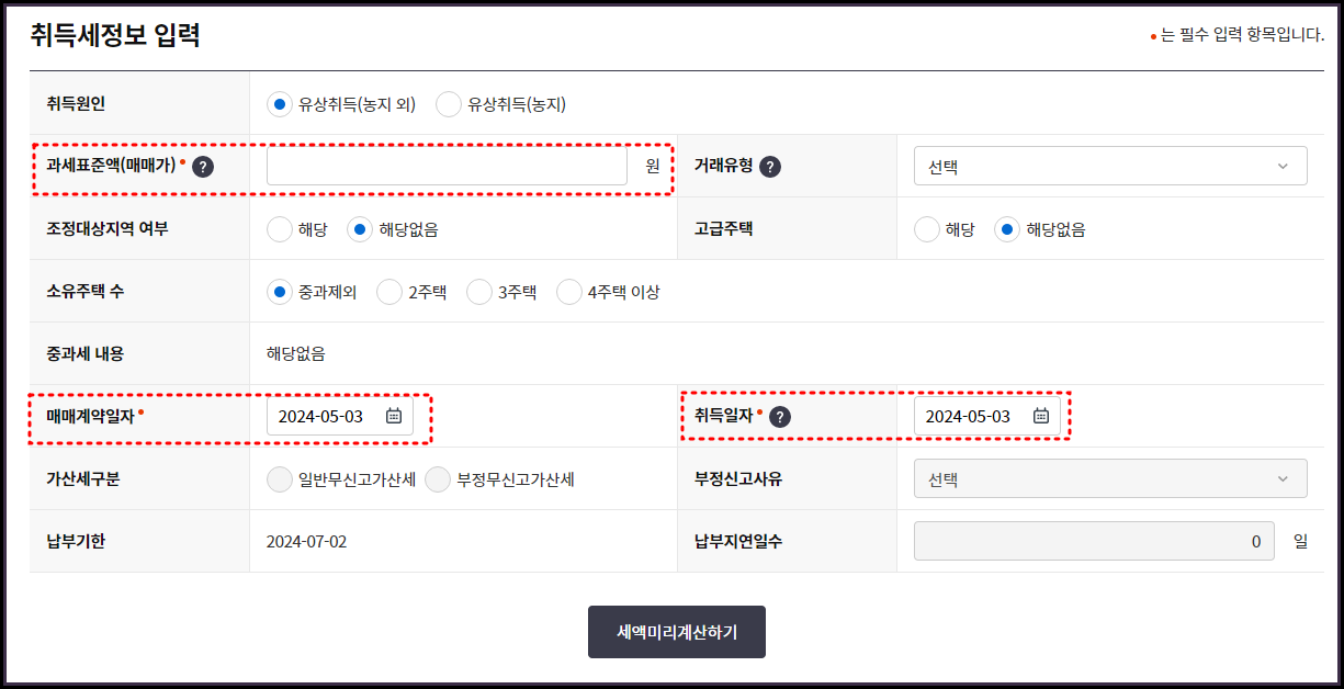 특히, 계산 시 가장 중요한 부분은 과세표준금액과 매매계약일자, 취득일자는 정확하게 입력해야 합니다. 해당기준을 토대로 2 주택여부, 세율적용여부 등이 적용되니 최대한 정확한 정보를 입력해 주세요.