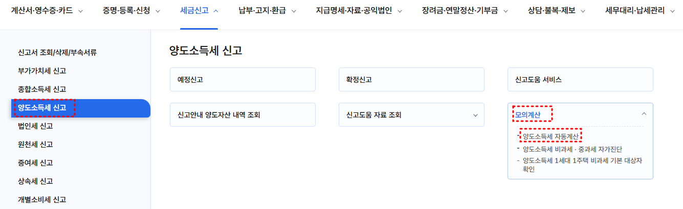 우선, 국세청 홈택스 웹사이트에 접속해 ‘세금신고 > 양도소득세 신고 > 모의계산 > 양도세 자동계산 ’ 메뉴로 이동합니다.