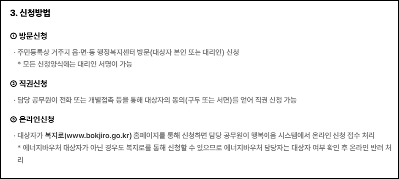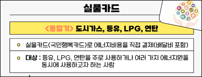 - 사용방법 : 에너지바우처 신청 후, 은행 등에서 국민행복카드를 발급받아 에너지원 직접 구입