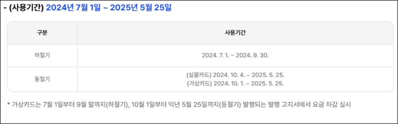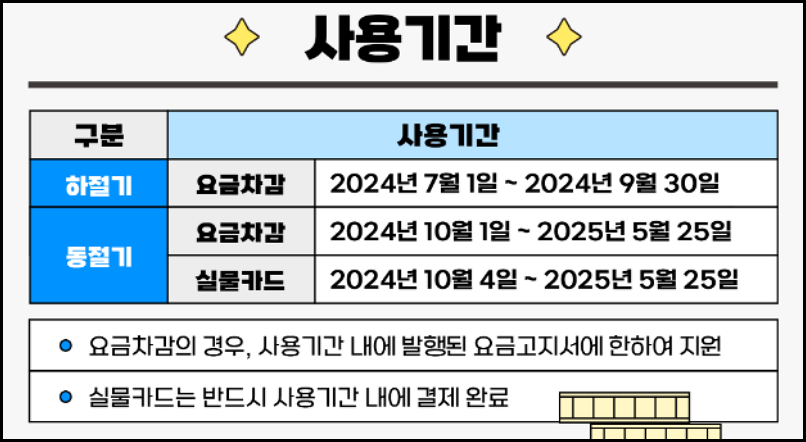 2024년 에너지 바우처 사용기간은 24년 7월 1일부터 25년 5월 25일까지입니다. 단, 하절기용으로 지급받은 바우처는 7월 1일부터 9월 30일까지 사용해야 하며, 동절기 바우처는 25년 5월 25일까지 사용해야 합니다.