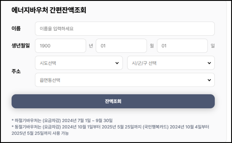 - 온라인 조회: 에너지 바우처 공식 웹사이트에 로그인하여 잔액을 확인할 수 있습니다.