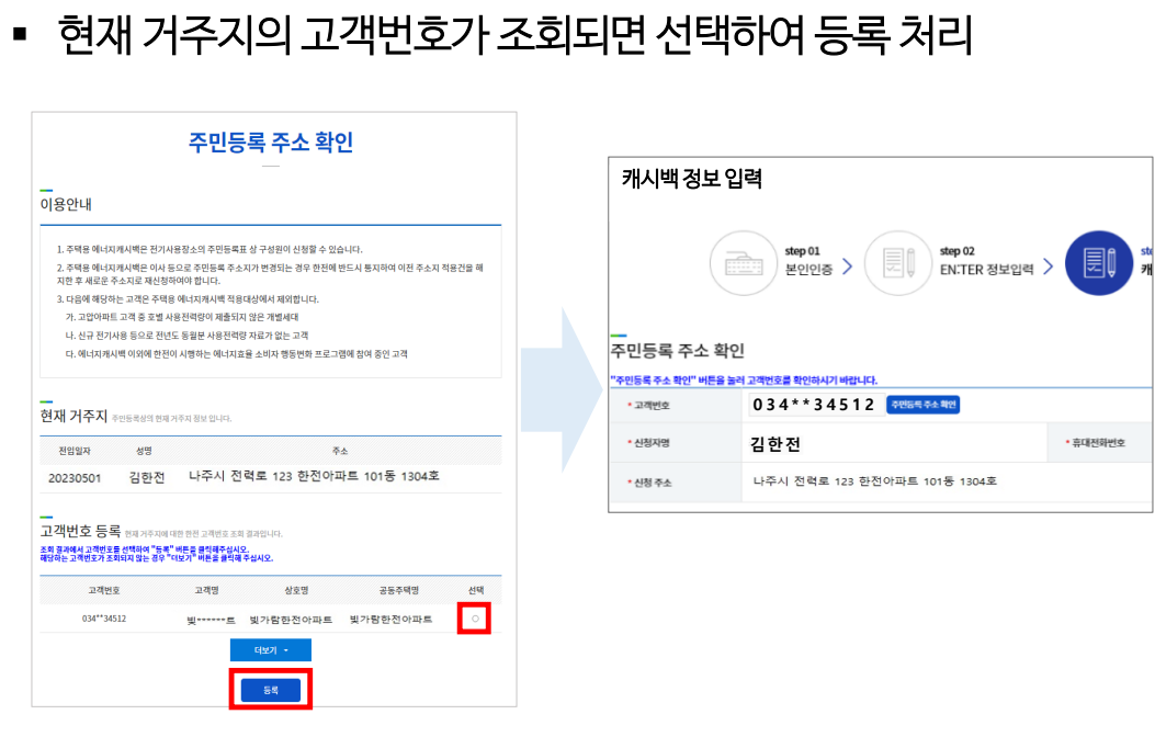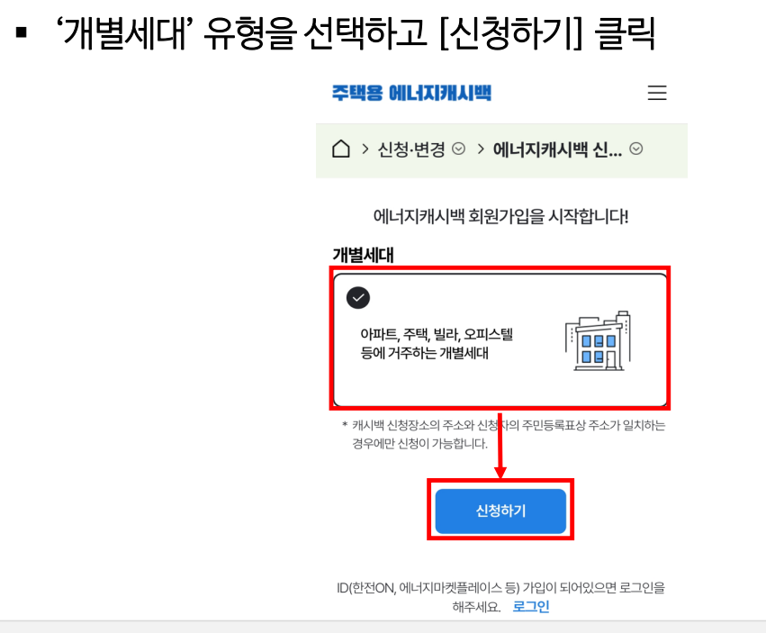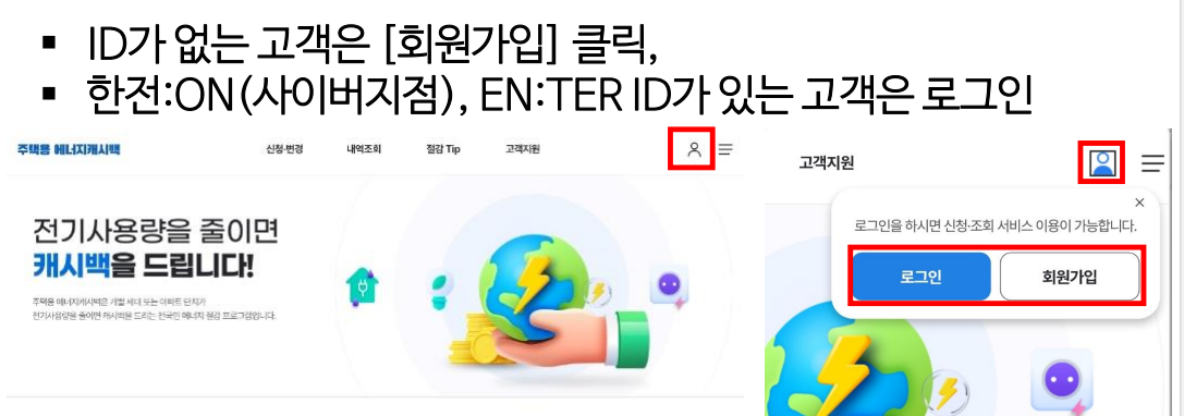 에너지 캐시백 공식 홈페이지에 접속해 회원가입 후, 본인 인증 및 주소 등록을 하면 신청이 완료됩니다. - ‘한전ON’ 앱 신청