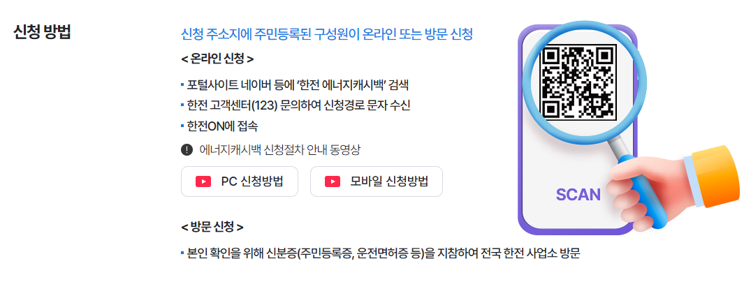 온라인 신청이 어려운 분들은 신분증을 지참하여 가까운 한전 지사 또는 사업소를 방문해 에너지 캐시백을 신청할 수 있습니다.