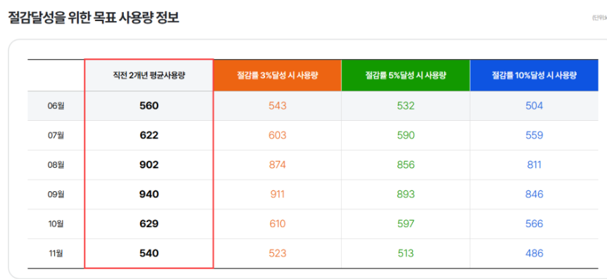2년간의 평균 사용량과 목표 사용량이 그래프로 표시되어 있어, 매달 얼마나 절약하고 있는지 한눈에 볼 수 있습니다.