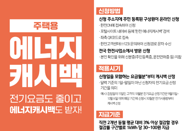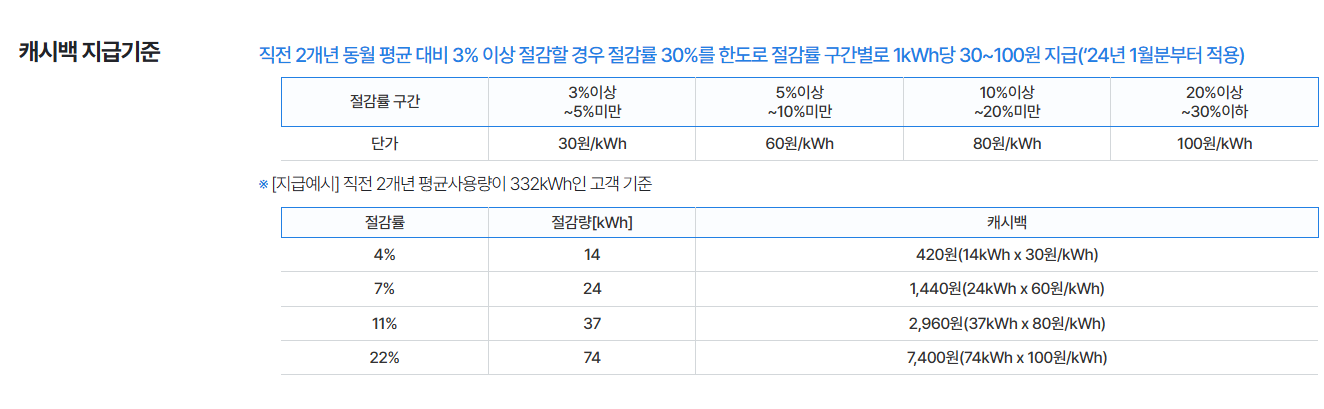 전년도 같은 기간 대비 3% 이상 절약하면 캐시백 지급이 시작되고, 절감률이 높을수록 1kWh당 30원에서 최대 100원까지 에너지 캐시백이 지급됩니다.