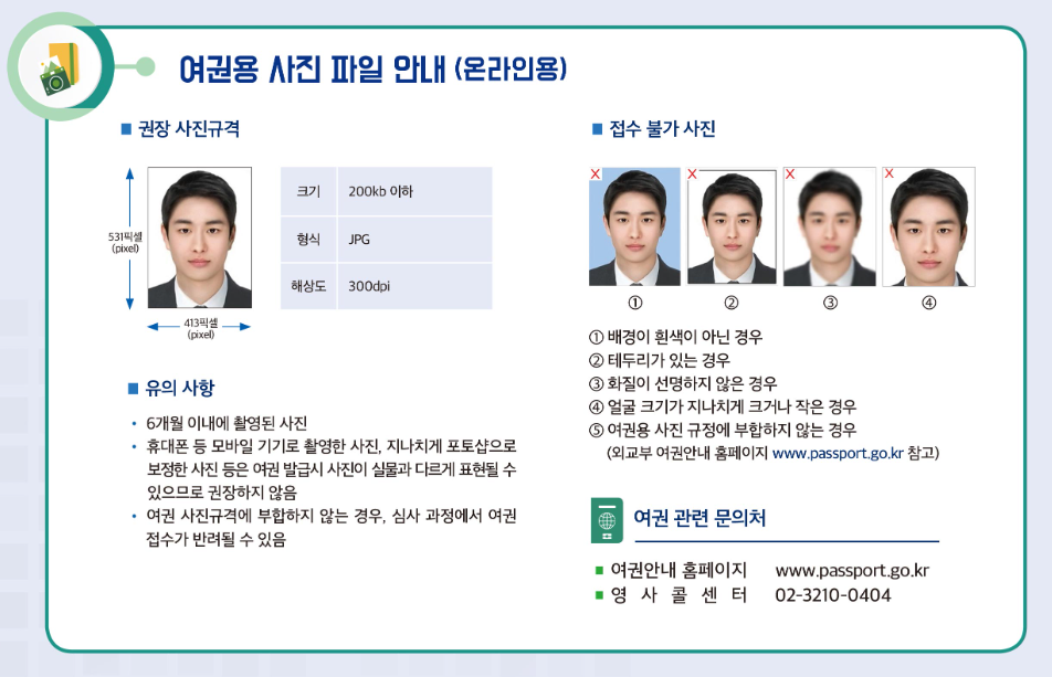 사진은 규격에 맞지 않을 경우 신청이 반려될 수 있으므로, 외교부 여권안내 홈페이지에서 사진 규정을 반드시 확인하시기 바랍니다.