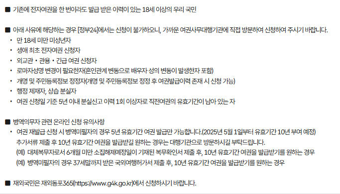 | 병역 미필자 | 병역 미필자의 경우 5년 유효기간 여권만 발급 가능하며, 추가 서류 제출 시 10년 유효기간 여권 발급 가능 |
