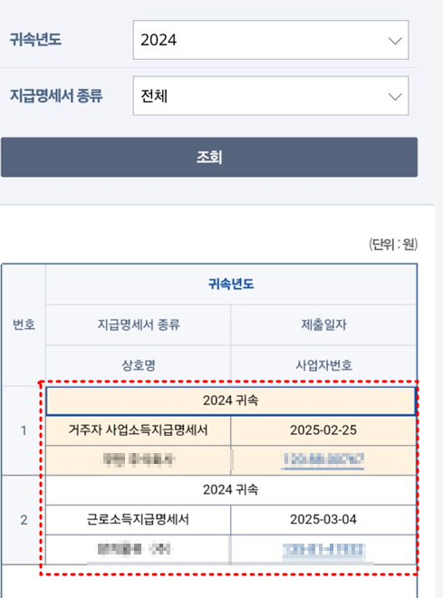 - '지급명세서 원천징수영수증 조회' 메뉴에서 확인