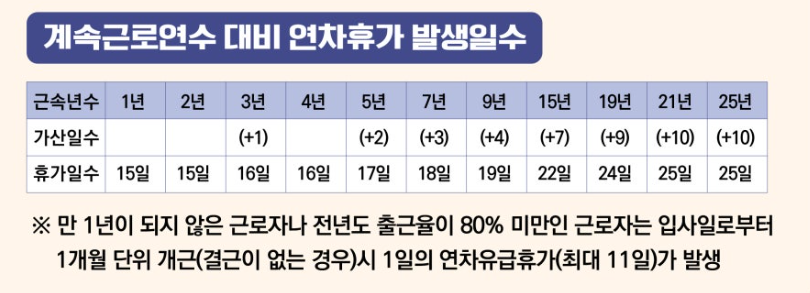 - 3년 근속 시: 근로자는 1년에 15일의 기본 연차 외에도 1일이 추가되어 총 16일의 연차가 발생합니다.