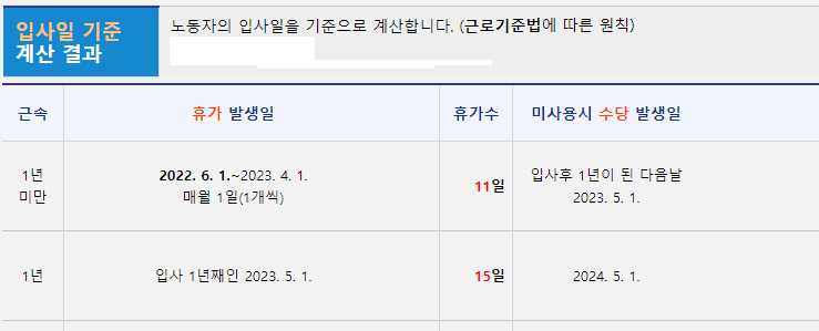 이후 입사 1년 차가 되는 2023년 5월 1일부터는 새롭게 연차가 발생하여 최대 15개를 2024년 4월 30일까지 사용할 수 있습니다.
