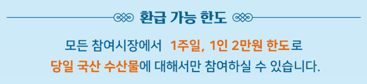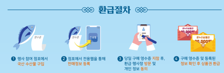 환급행사 참여 점포에서 '당일'에 국산 수산물을 구매한 고객 중 환급기준액 이상의 구매 영수증을 지참하면, 최대 2만원을 온누리상품권 환급을 해줍니다.