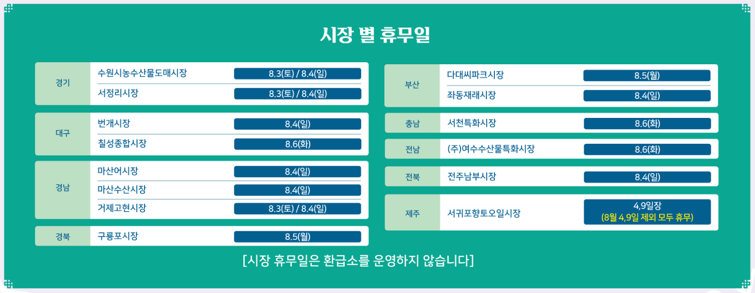 마지막으로, 각 시장의 휴무일에는 행사가 운영되지 않으므로, 참여하려는 시장의 휴무일을 미리 확인해야 합니다.