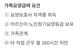 요양보호사 가족케어 급여를 받기 위한 자격 조건은 매우 구체적이고 엄격합니다.