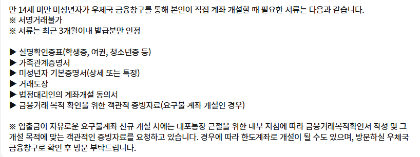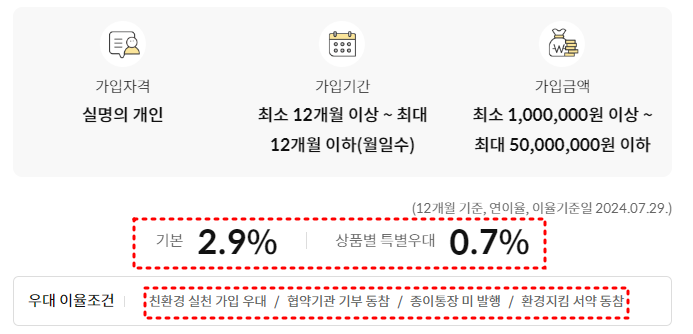 가입 조건은 만 17세 이상의 성인이라면 누구나 신분증을 지참하여 예금가입이 가능합니다. 만일, 14세 미만의 미성년자가 예금가입을 하기 위해서는 부모나 법정 대리인의 계좌개설 동의서가 필요합니다.