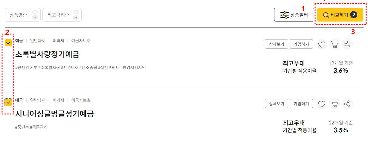 우선, 우체국 예금상품목록에서 좌측 상단의 비교하기 버튼을 누르고, 비교하고자 하는 상품을 선택하고 다시한번 비교하기 버튼을 클릭하면 각 상품의 금리와 정보를 한눈에 볼 수 있습니다.