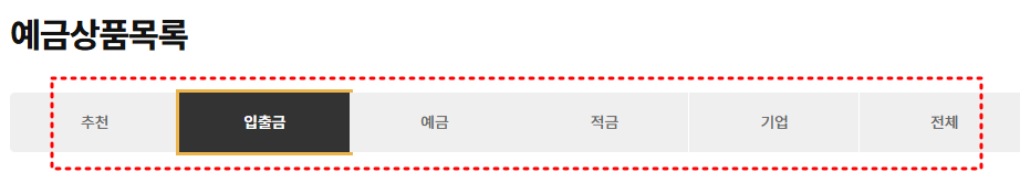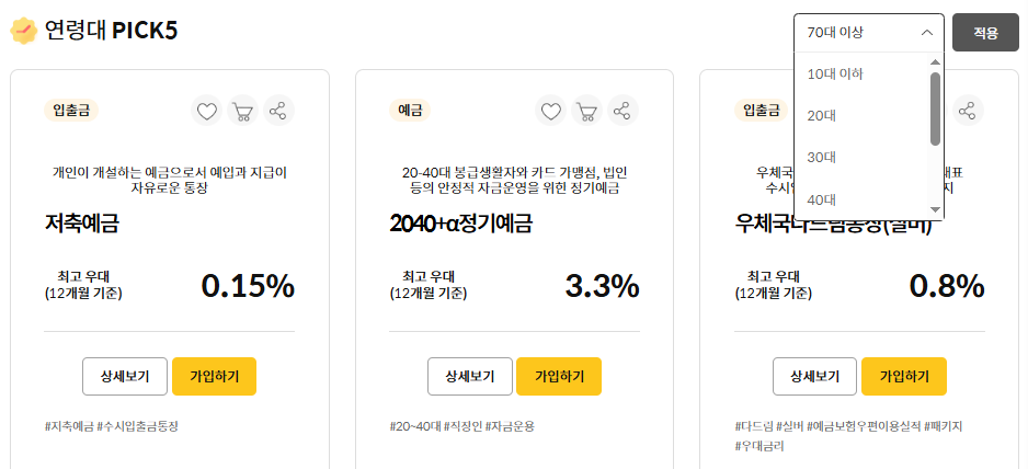 뿐만 아니라, 예금상품 탭에서는 연령대 PICK5 정보를 제공하고 있습니다. 입출금, 예금을 총 합쳐서 10대, 20대, 30대, 40대, 50대, 60대, 70대 층에서 어떤 상품을 많이 선호하는지 확인할 수 있습니다.