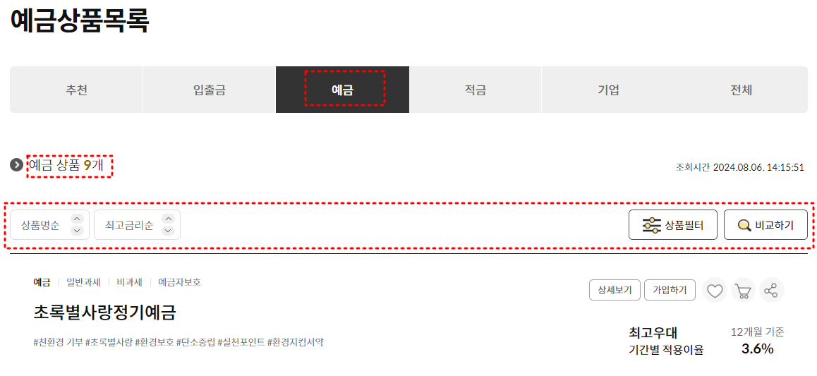 예를 들어, 2024년 8월 6일 기준으로 초록별사랑정기예금 상품은 12개월 거치 기준으로 최고 3.6%의 우대금리를 제공하고 있는 것을 파악할 수 있습니다.