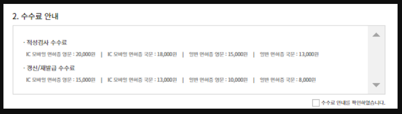 운전면허 적성검사 수수료는 일반면허증 13,000원이며, IC모바일 면허증 국문은 18,000원입니다.