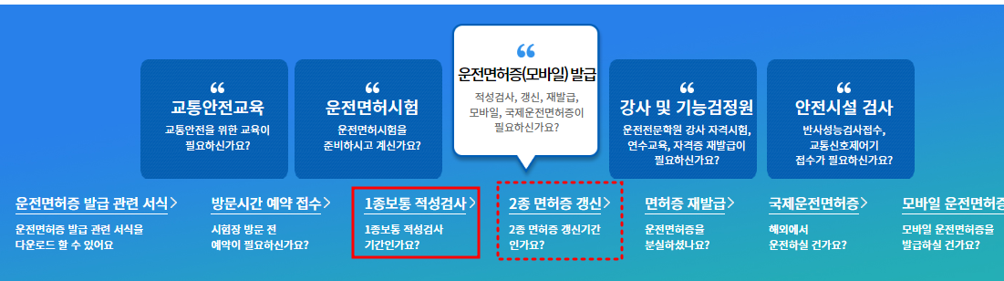 안전운전 통합민원 홈페이지에 접속하여 메인페이지의 '운전면허증발급' > [1종보통 적성검사] 또는 [2종 면허증 갱신]을 선택해 줍니다.