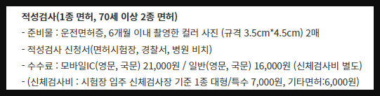 신체검사 비용은 1종대형, 특수의 경우 7천 원이며, 기타 면허는 6천 원이 부과됩니다.