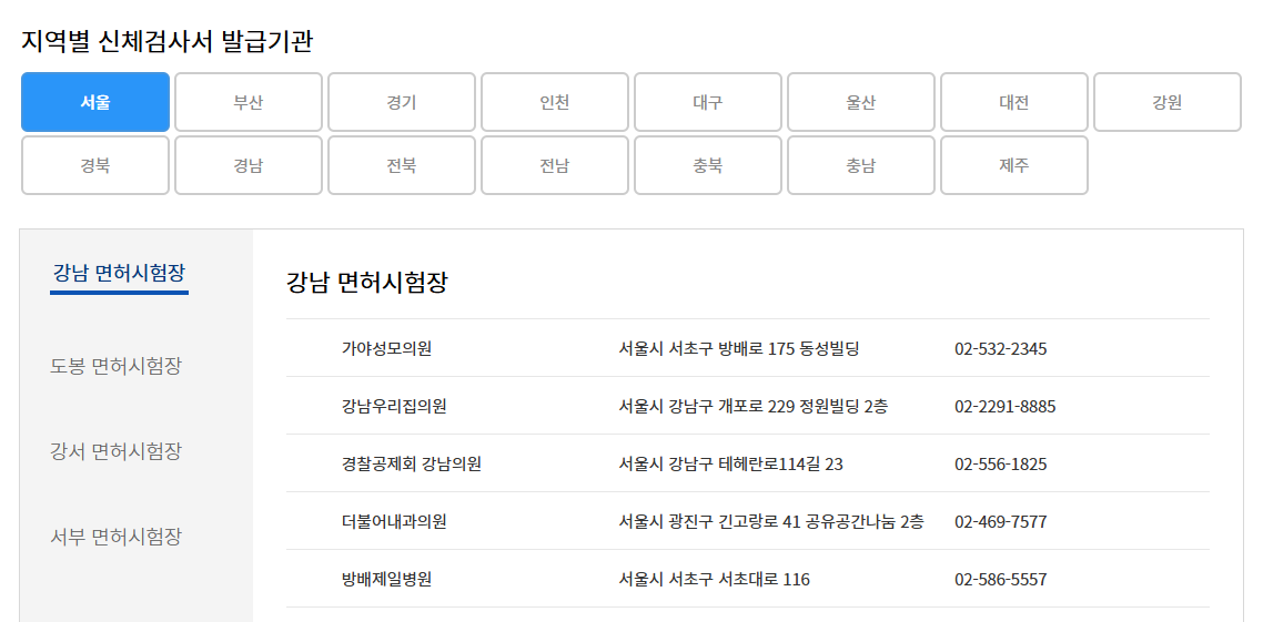 신체검사 가능한 병원은 도로교통공단 홈페이지에서 '운전면허 적성검사 지정 병원 조회' 메뉴를 통해 지역별로 검색할 수 있습니다.