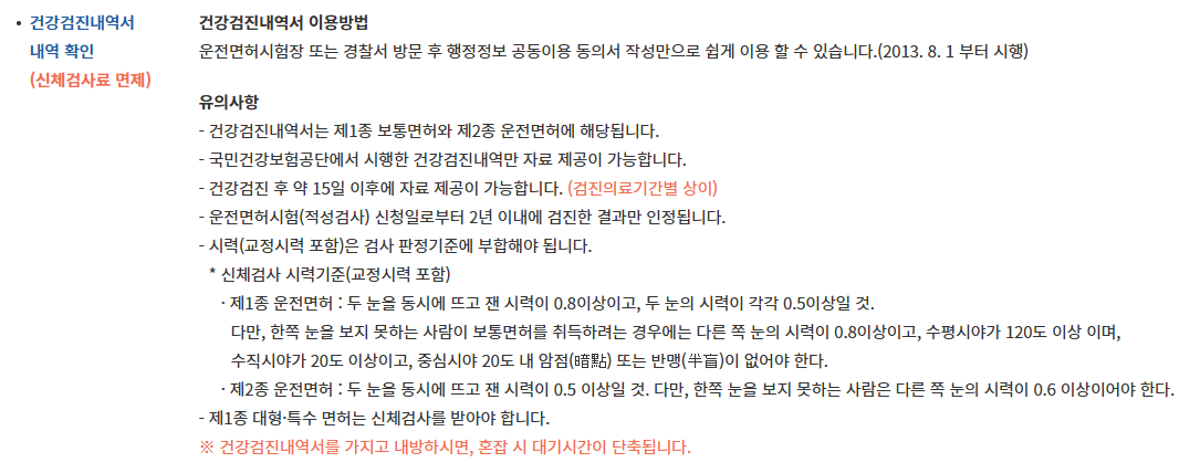 하나의 팁을 드린다면, 최근 2년 이내에 건보공단에서 진행하는 국가건강검진이 있다면 운전면허 적성검사 신체검사 단계를 건강검진결과 내역으로 대체할 수 있습니다.