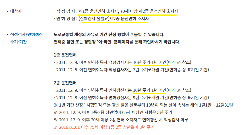 - 70세 이상 제2종 면허 소지자: 5년마다 적성검사 필요