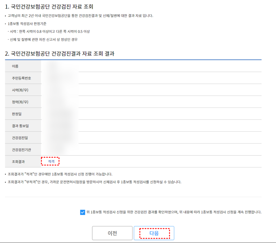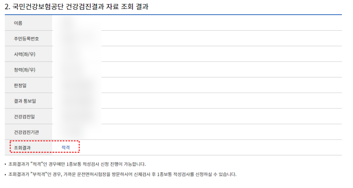 하나의 팁을 드린다면, 최근 2년 이내에 건보공단에서 진행하는 국가건강검진이 있다면 운전면허 적성검사 신체검사 단계를 건강검진결과 내역으로 대체할 수 있습니다.