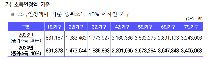 2024년 기준으로 1인 가구의 소득인정액 기준은 891,378원, 4인 가구는 2,291,965원 이하입니다.