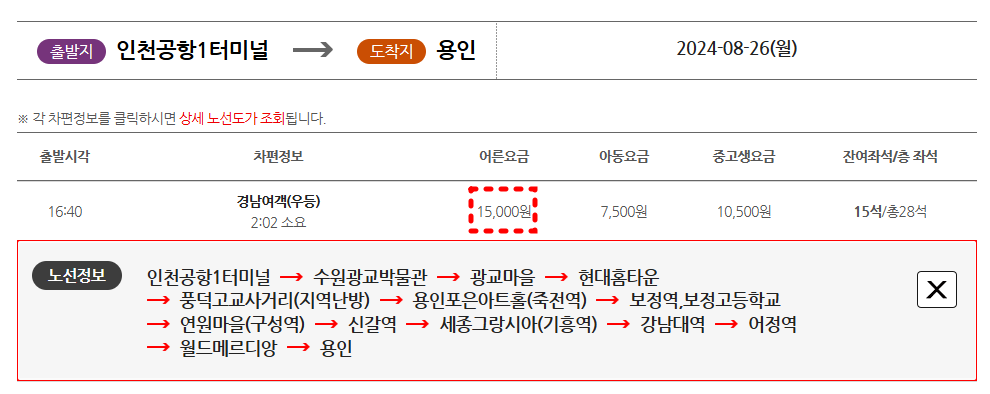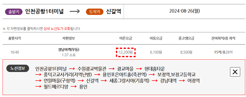 예를 들어, 신갈역으로 가는 리무진버스의 요금은 어른 약 12,200원이며, 용인으로 가는 리무진의 버스 요금은 약 15,000원입니다. 요금은 거리에 따라 달라지며, 탑승 전 반드시 확인하는 것이 좋습니다.